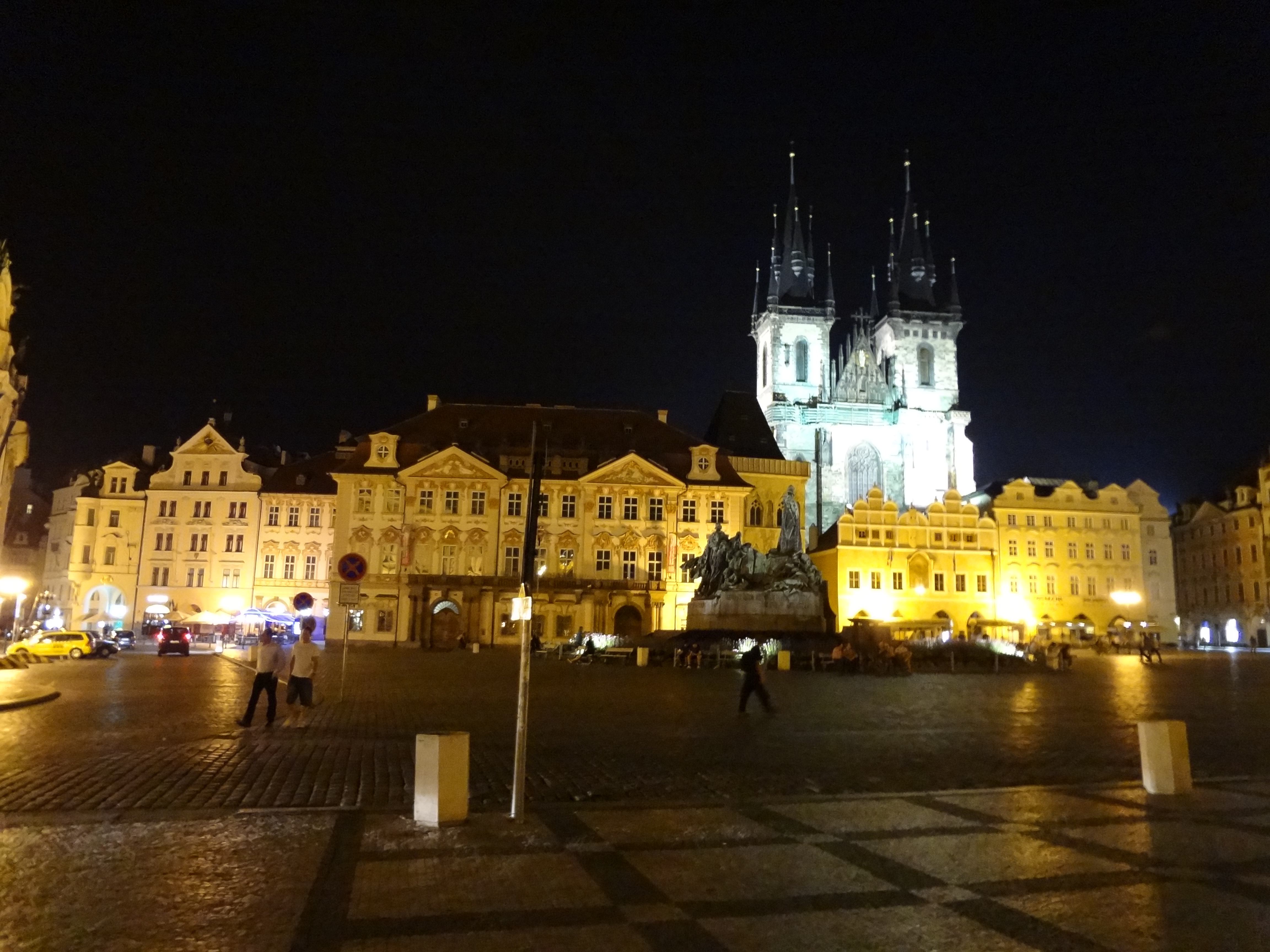 The mystery of Týn Church in Prague old town square eerily looming in the background with the warm glow of street lamps in the foreground.