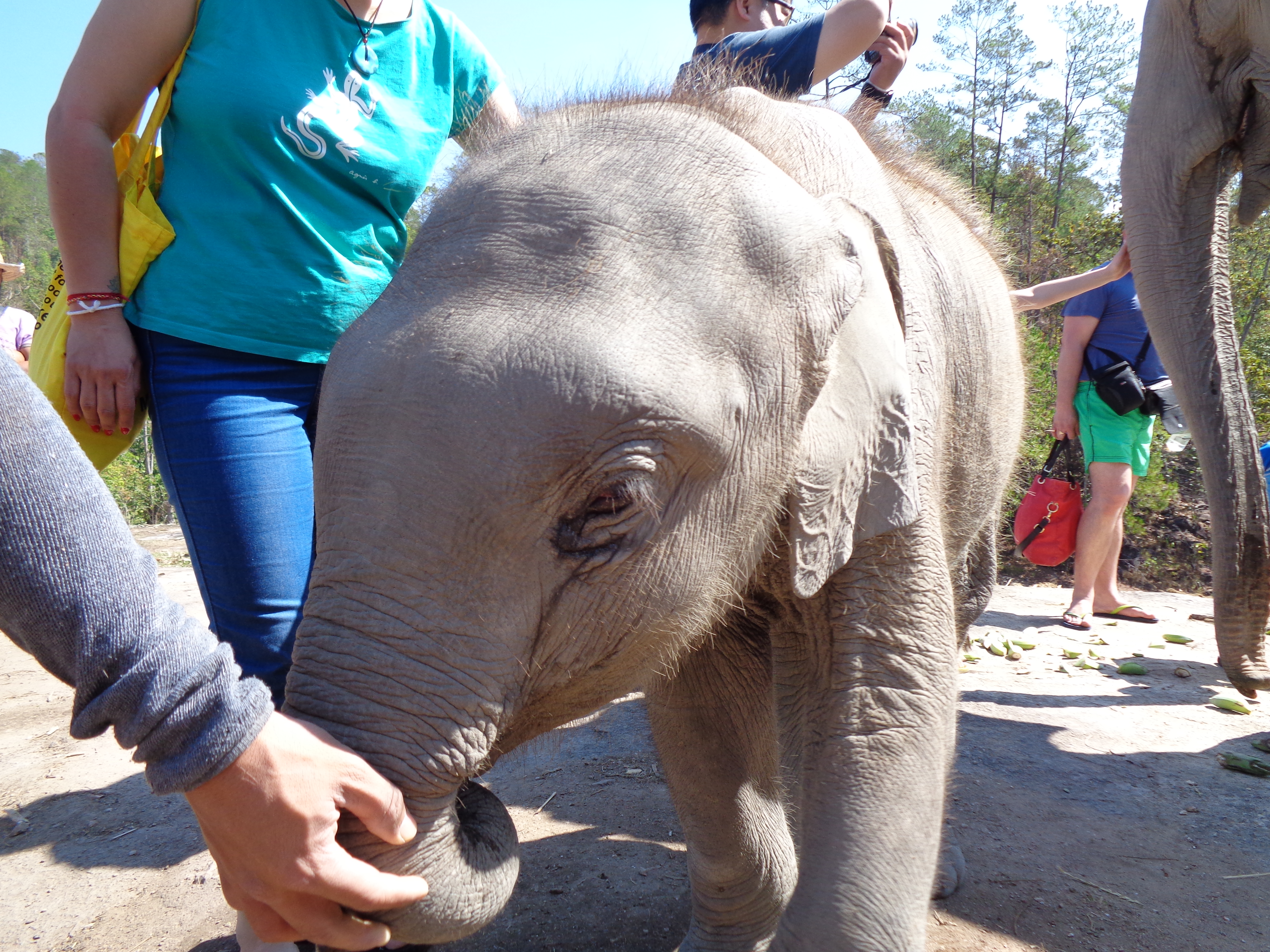 Our group consisted of just eight and the drive from Chiang Mai to Ban Pong in a small mini bus took about an hour.  We climbed up and up the mountains, eventually turning down a steep, wooded rough track that opened up to a clearing and there waiting to greet us was a female elephant and her baby.