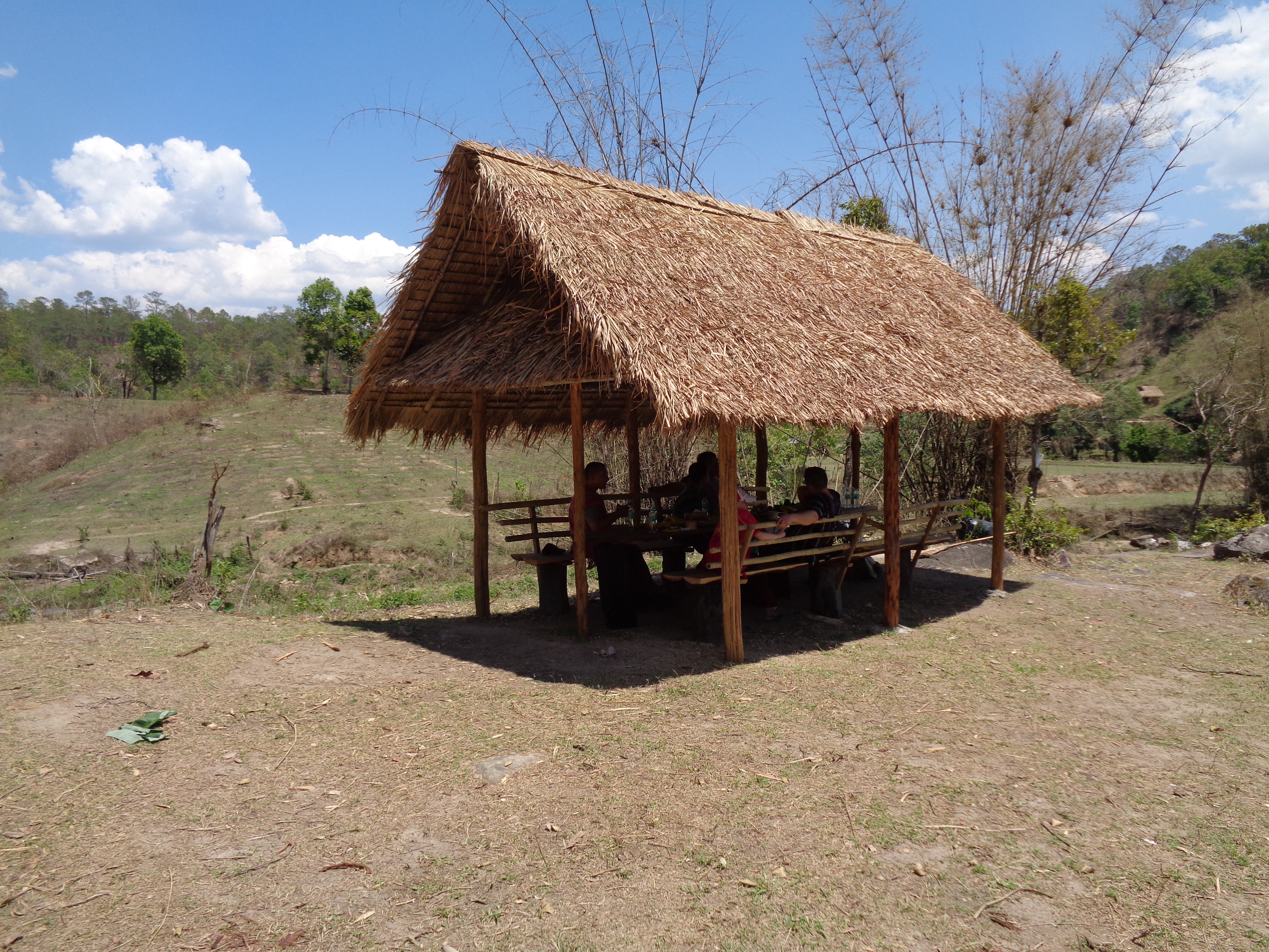 We plodded up the river for about thirty minutes before dismounting our charge – easy, instruct your elephant to lower its head and slide down the trunk.  Just a short walk up a gentle slope to a straw thatched hut and our lunch had already been laid out by the two women.  It was a super spread of chicken drumsticks, sticky rice wrapped in banana leaves, cakes and fruit.  The bottled water was hot after being set in the sun all morning but we didn’t care, we were in the middle of nowhere!