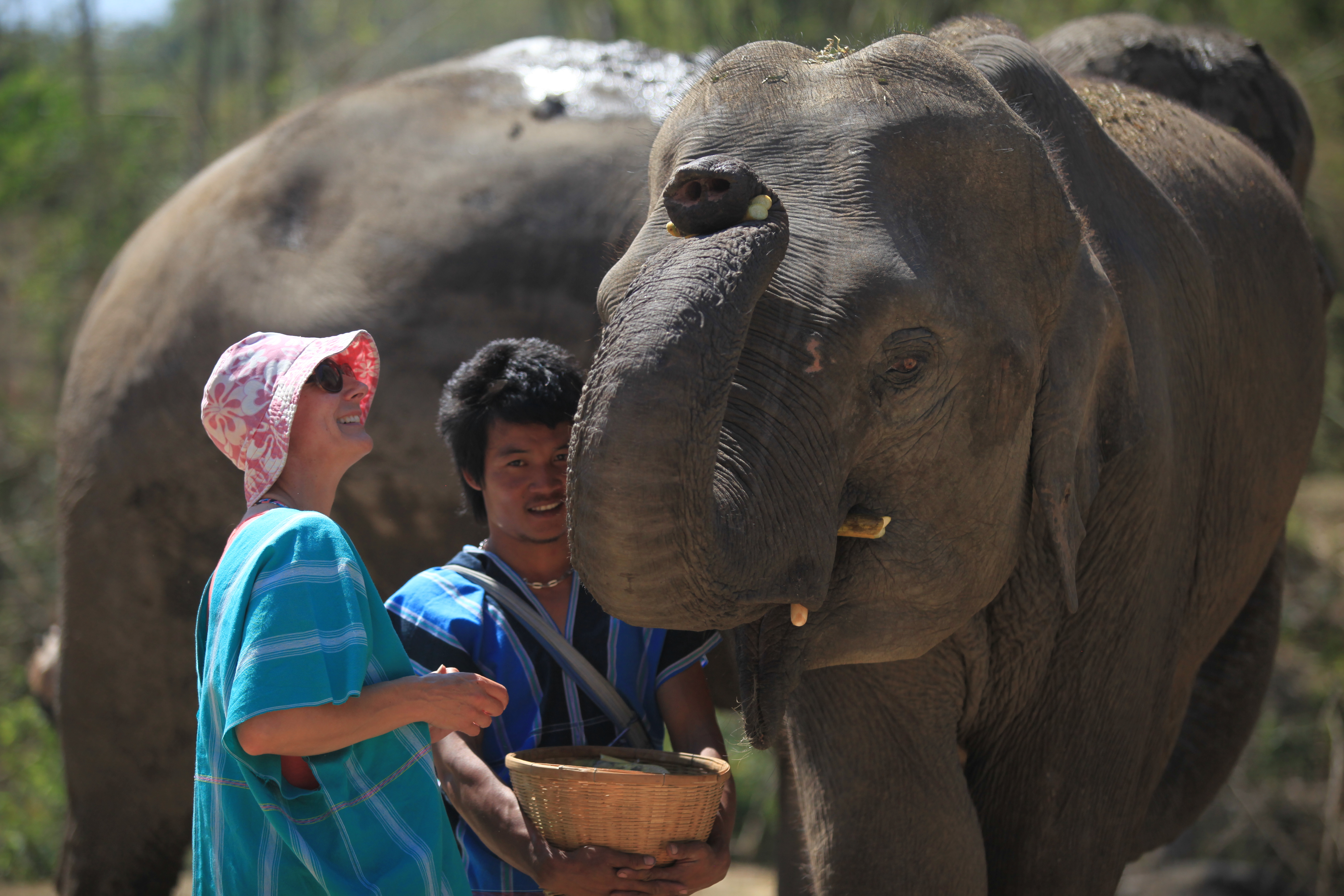 I was paired with the dancer of the herd Ploy.  She was a big gal and understandably I was nervous – of her feet mainly.  I was handed a basket of bamboo and bananas.  My guide demonstrated how to feed her, either straight into the mouth or offered to the end of her trunk for self-feeding.  This was an instant bonding success. By now Ploy had accepted me, so much so she reached up with her trunk and kissed me on the neck.  She nuzzled her trunk into my neck like a suction cup before she blew dust accompanied by a snort at me – I felt honoured.
