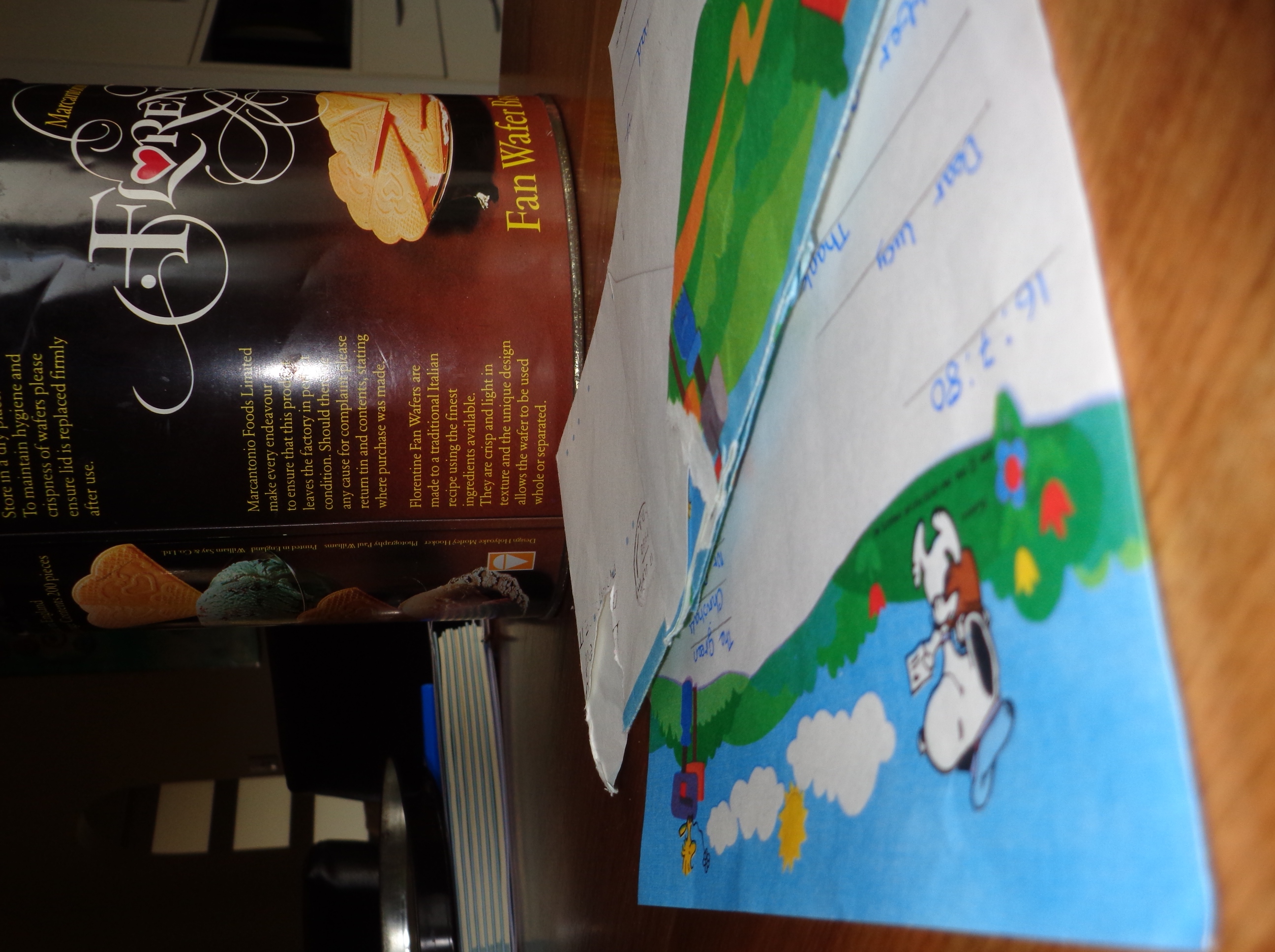 At the end of last year the family were having a mass clear out in preparation for some renovations and I came across my ‘wafer tin’ which stores all the letters I’ve kept over the years. The letters mainly stem from the late 70’s and right through the 80’s. The day after my thirteenth birthday my family moved home and I started corresponding with my best friends. For some reason I’ve always kept the letters and it gave me such joy to sift through them. They smelled musty, probably from once being stored in the loft. Reading through them rekindled so many childhood memories, I was transported back in time to various events during my teen years and all of a sudden the old grey matter was remembering and reliving the moment – thank you brain!
